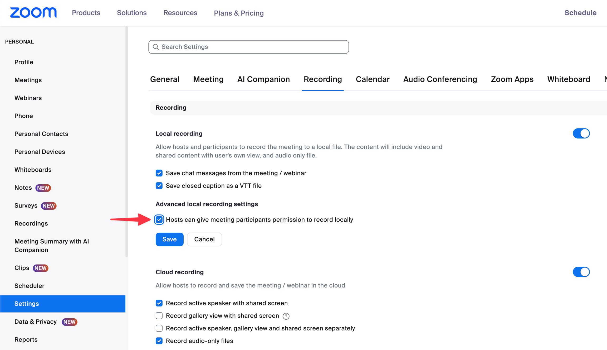 The host's local recording setting is disabled